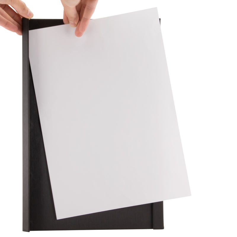 Securit® Magnetic termékcsalád - A4 méretű, műbőrből készült mágneses étlaptartó, melynek hosszabb oldalaiba helyezett mágnesek rögzítik a menülapot. 1 db A/4-es oldal rögzítésére alkalmas. Szín: fekete
