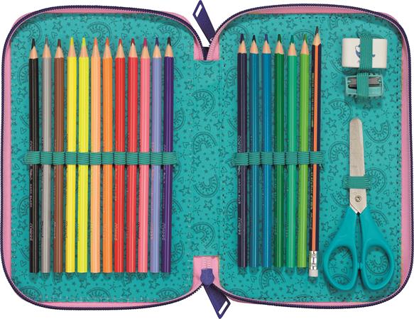 Praktikus töltött tolltartó divatos mintával, amely minden szükséges írószert tartalmaz a tanórákhoz. Két emeletes kialakításának köszönhetően a ceruzák, radírok, ollók és egyéb eszközök átláthatóan rendszerezhetők benne.